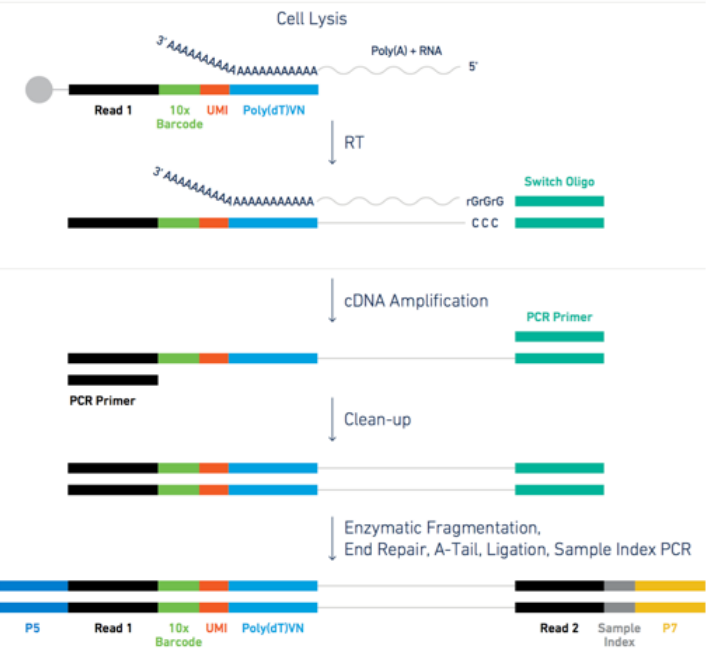 - each transcript in the cell is captured via the bead and assigned a cell barcode and a transcript unique molecular identifier (UMI)