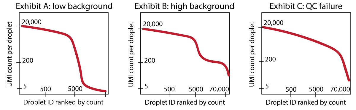 If you have a dataset where you can identify an empty droplet plateau by eye (Exhibit B in Figure 6), and these empty droplets have 50 or 100 or several hundred counts, then it can be advisable to use a specific software to remove the background transcripts (e.g. CellBender (Fleming et al. (2023)), SoupX (Young and Behjati (2020))).