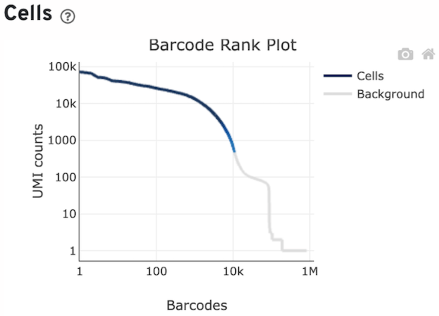 Below, the knee plot from the control 1 sample used in this analysis. You can see that around 10,000 cells with above ~1000 UMIs seems to be coinsidered of decent quality by cellranger (the part of line coloured in blue). Note that the last plateau is located at a very low amount of UMIs, meaning there is not really any relevant contamination from ambient RNA.