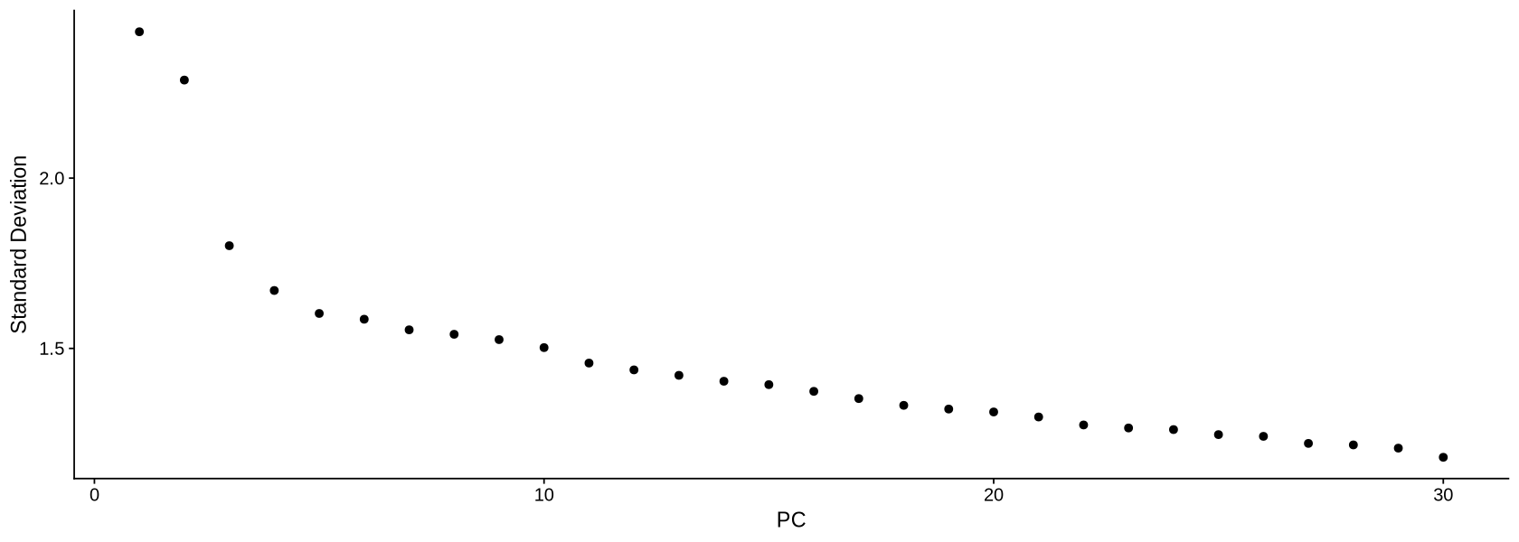 dataNorm <- RunPCA(object = dataNorm, verbose = FALSE, seed.use = 123)ElbowPlot(dataNorm, ndims = 30)
