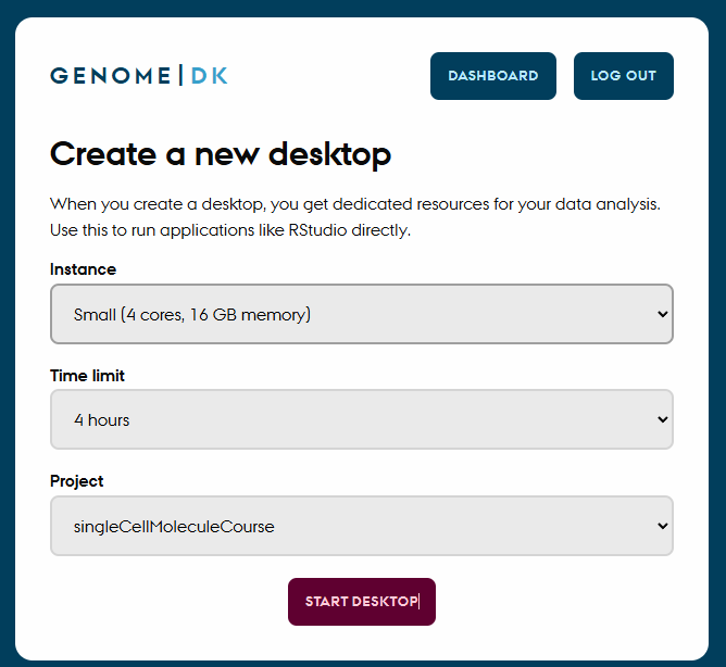 Start a new Desktopand then choose one with at least 8 cores. Choose some hours for the session and the projectsingleCellMoleculeCourse(figure below).