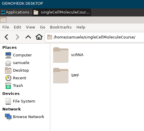 singleCellMoleculeCourse/, which is found in your home directory. Your home directory is/home/USERNAMEand is always shown as soon as you open the file explorer on the virtual desktop.Here you will see two folders: