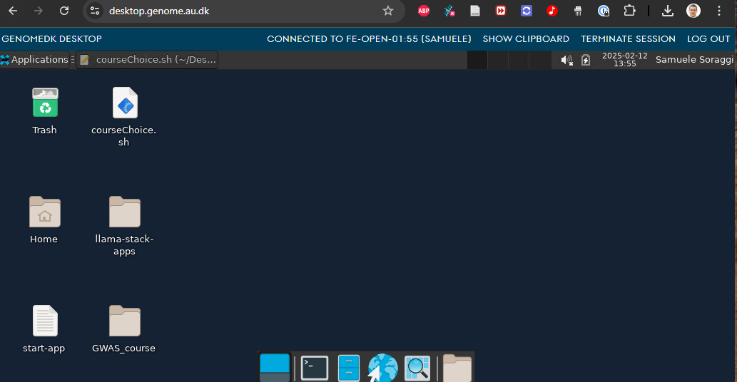 First of all, we open the desktop interface to GenomeDK at desktop.genome.au.dk. Choose the Front end for the login.