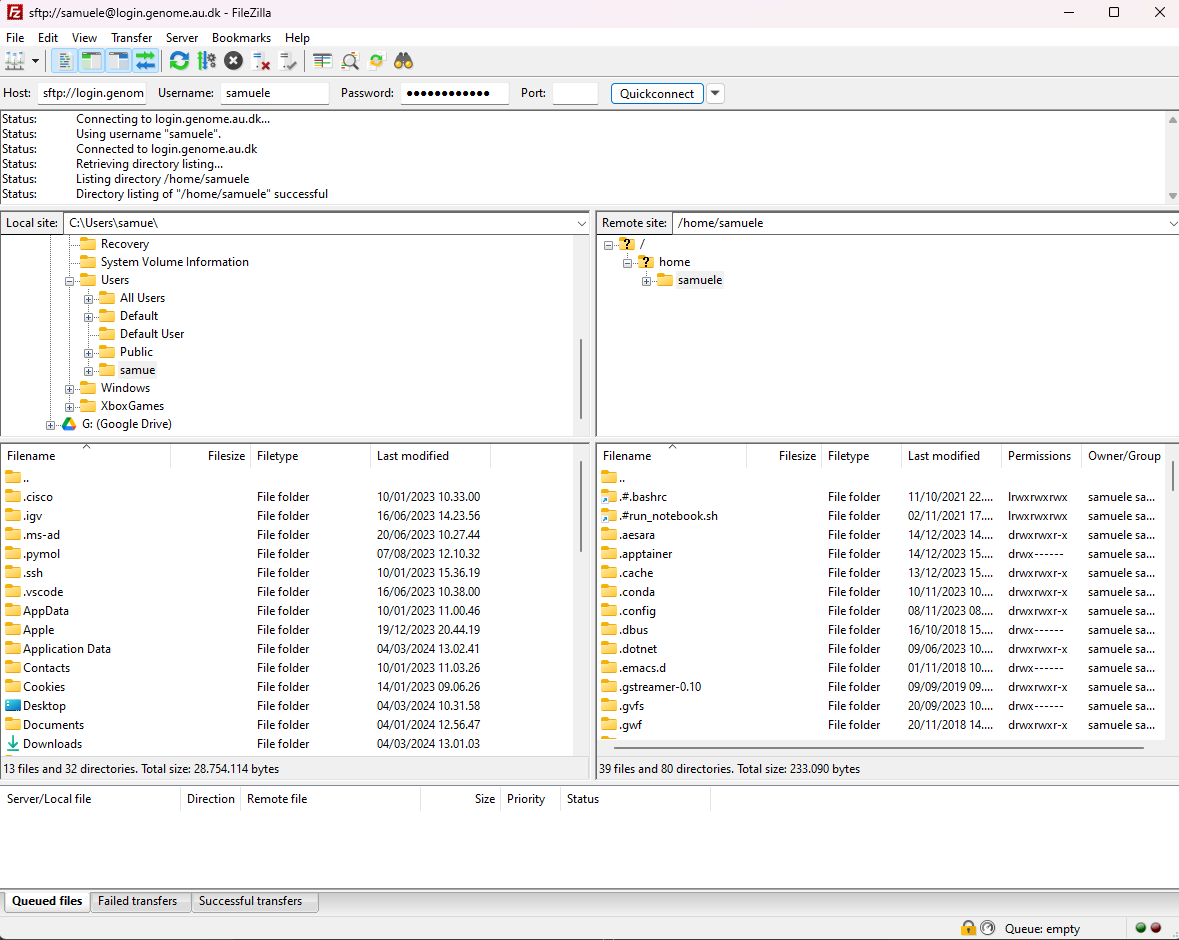 login.genome.au.dkGenomeDK username and password22Press on Quick Connect. As a result, you will establish a secure connection to GenomeDK. On the left-side browser you can see your local folders and files. On the right-side, the folders and files on GenomeDK starting from your home.