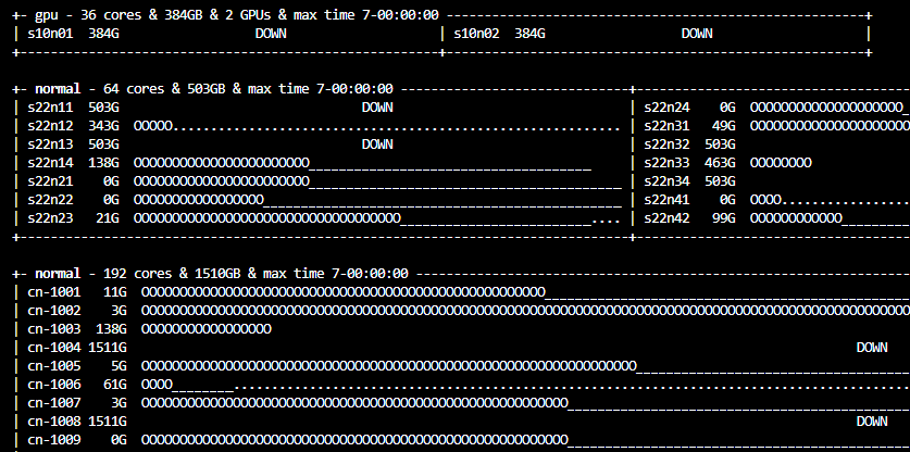 Usage of computing nodes. Each node has a name (e.g. cn-1001). The symbols for each node mean running a program (0), assigned to an user (_) and available (.)