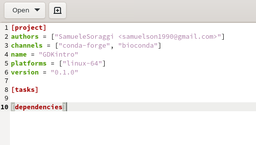 Open pixi.toml with the text editor, and make sure you have the two channels conda-forge and bioconda. If not, modify the file so the channel list is like below.